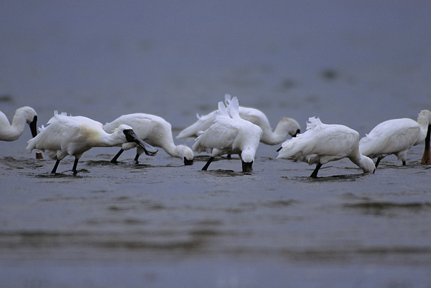 クロツラヘラサギの有名?な餌取り。くちばしを左右に振りながらひょいひょいと走り回り、くちばしに触れた魚や小動物をぱくりと食べる。