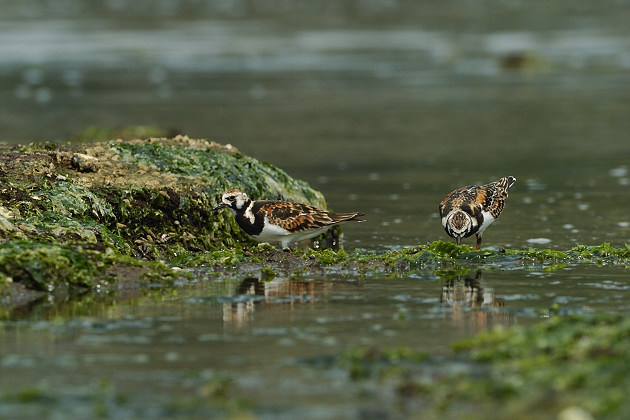 仲間のキョウジョシギはみんな北の繁殖地へ飛び去って、最後?に残った2羽。石ではなくアオサをひっくり返してエサを探します。